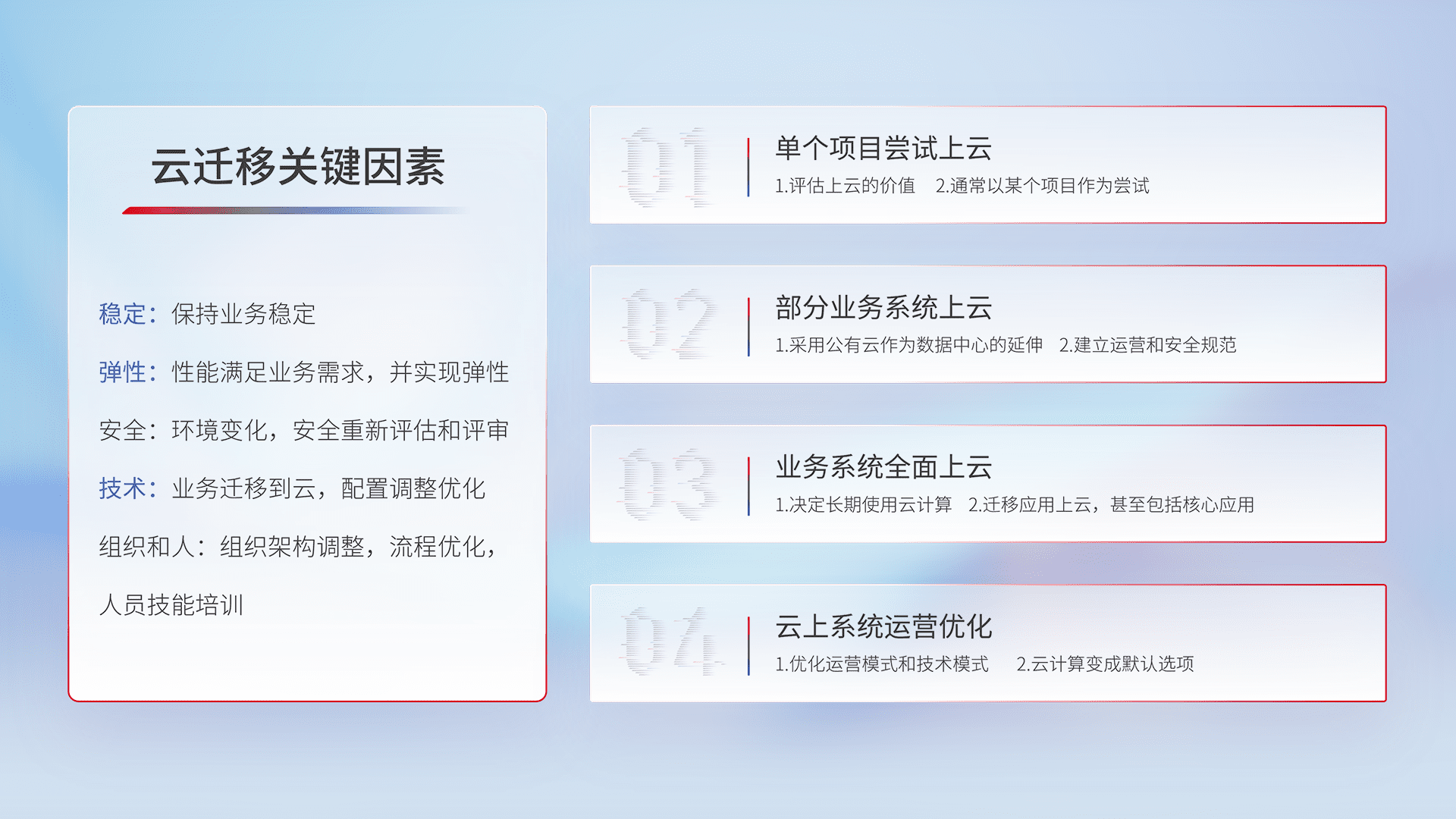 结合实际业务,,,从规划设计、、云平台选型、、云原生改造、、、、数据迁移、、集成交付,,,迁移全过程为客户识别最佳上云路径,,做好风险识别管理,,,设计网络架构、、、身份权限、、、、安全审计合规、、、、操作审计、、日志审计、、、、监控告警策略、、多站点容灾设计等,,,对云上基础设施进行整体规划,,提升IT治理水平,,,以满足弹性、、、高可用、、、高性能的需求。。。。