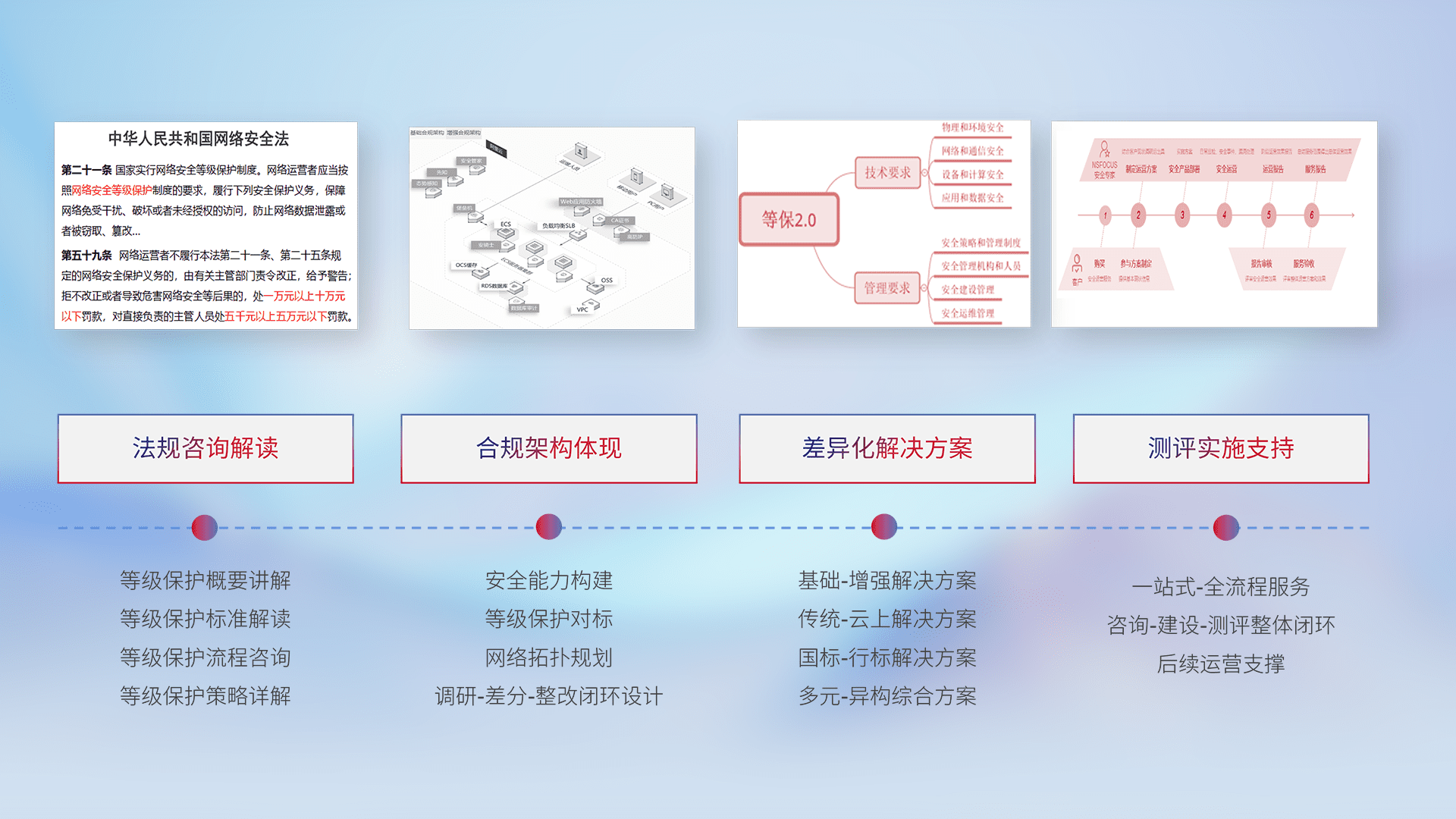 通过专业的法律咨询解读、、合规架构体现、、差异化解决方案、、、、测试实施支持等服务,,,,为客户量身打造等保合规体系。。。。